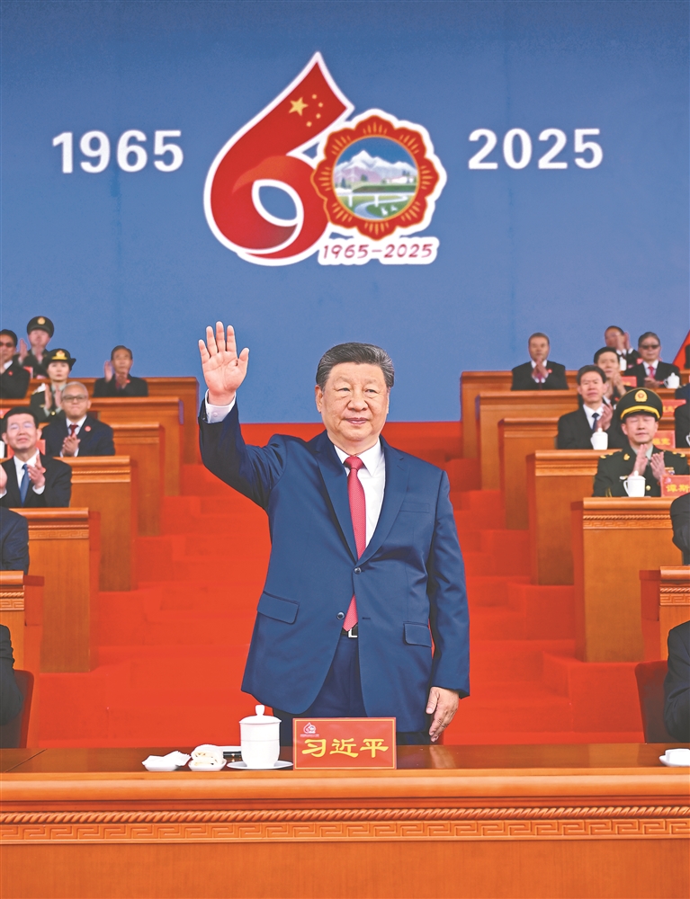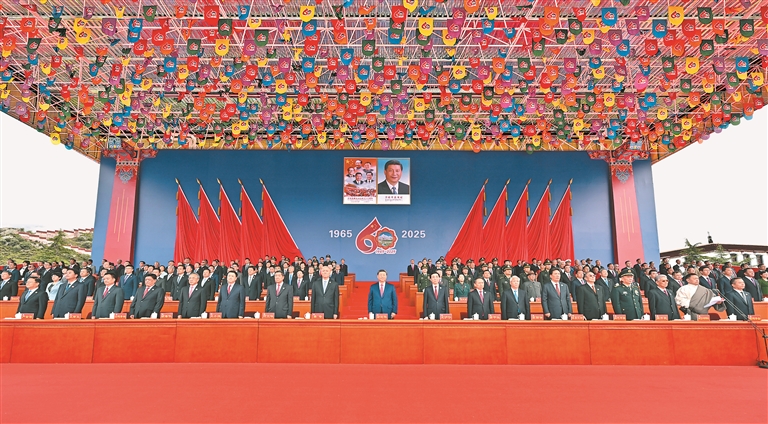 王沪宁发表讲话。他说,1965年9月,在党中央亲切关怀和党的民族政策光辉照耀下,西藏自治区宣告成立。这是西藏发展史上具有划时代意义的大事,巩固了西藏和平解放和民主改革的伟大成果,实现了西藏社会制度的历史性跨越。60年来,西藏经济社会全面发展,民族区域自治制度成功实践,民族团结日益巩固,各族人民生活蒸蒸日上,充分展现了中国共产党领导的坚强力量,充分展现了我国社会主义制度的显著政治优势。