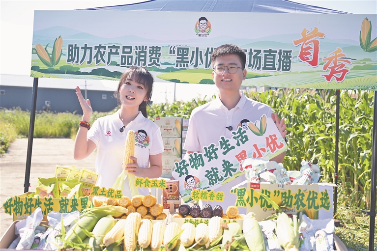 “好物好生活,就来黑小优!”8月的哈尔滨市道里区榆树镇望哈村,万亩玉米田绿浪翻涌。一群年轻人架起直播设备,将镜头对准了正在采收的鲜食玉米——这里是黑龙江日报报业集团“黑小优百场助农直播”的首秀现场。