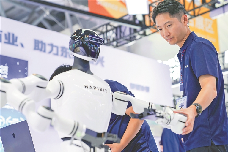 工作人员在第十五届中国-东北亚博览会现代化产业馆内调试展出的具身智能机器人产品。