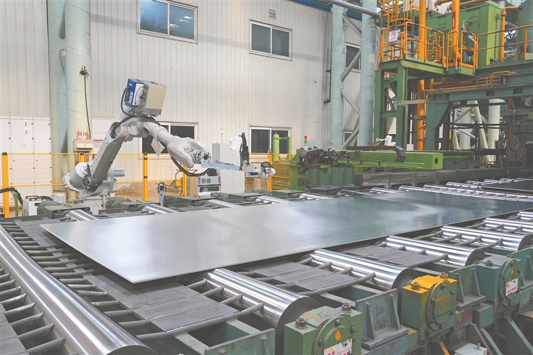 “过去人工测量不仅效率低,还容易出现视觉误差和安全风险。”中厚板厂厂长韩春元指着正在作业的机械臂说,这两台银白色机械臂构成的生产线宛如精密钟表,将测量工序的误差控制在0.01毫米以内。