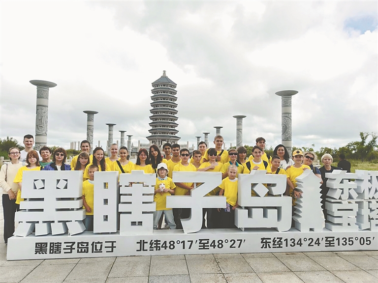 俄罗斯青少年代表团在黑瞎子岛东极宝塔前合影。
