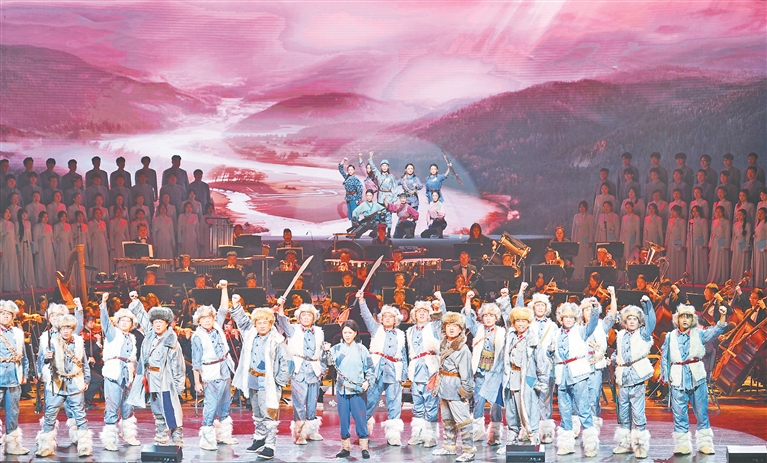 交响组歌《满怀深情望北京》《北大荒人的歌》《我爱你,塞北的雪》相继唱响。黑土地的精神谱系在歌声中徐徐展开——东北抗联精神、北大荒精神、大庆精神、铁人精神……这些融入龙江儿女血脉的精神基因,引发全场强烈共鸣。当女声独唱《我爱你,塞北的雪》响起时,仿佛将北国的冰雪精灵都邀至剧场,使观众沉醉在这片神奇土地的深情告白中。