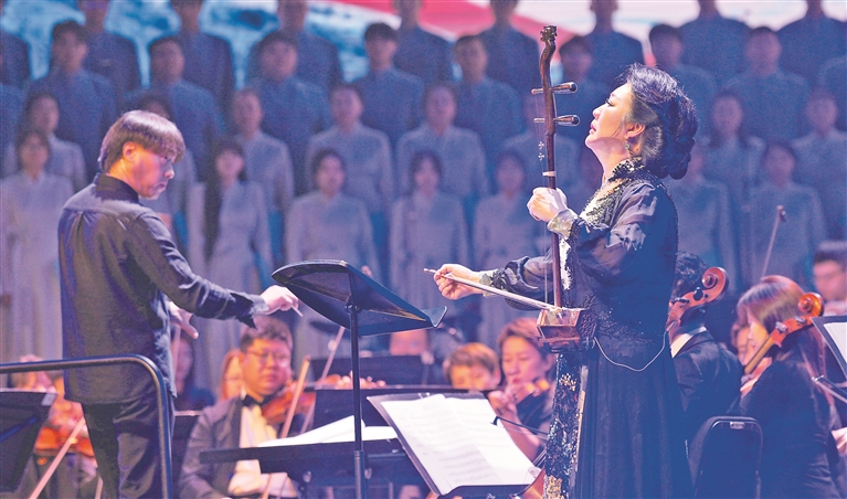 当舞台上英雄们的身影仍在观众心中激荡,《黑土英魂》组曲已如星河般倾泻而出,将演出推向高潮。交响合唱《英雄》以山呼海啸般的磅礴气势直叩人心,二胡与乐队《嫂子颂》深情缱绻地讲述了抗日军民之间跨越危难的深情厚谊,领唱与合唱《归来》则寄托着对抗日英烈深沉而崇高的追思……诗与乐将英雄的名字镌刻入心,化作永恒的丰碑。