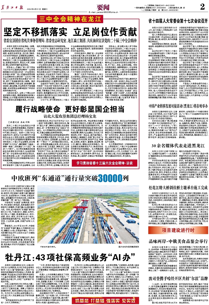 本报20日讯(记者王迪)记者从中国铁路哈尔滨局集团有限公司获悉,截至2024年8月20日,中欧班列“东通道”满洲里、绥芬河、同江铁路口岸累计通行量突破30000列、发送货物291万标箱,实现连年增长,呈现量质齐升的良好态势