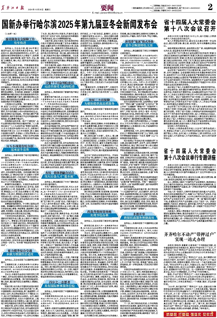 本报北京29日电(记者刘莉)29日10时,国务院新闻办举行哈尔滨2025年第九届亚洲冬季运动会新闻发布会。亚冬会组委会副主席、中国奥委会副主席周进强,亚冬会组委会副主席、黑龙江省人民政府副省长韩圣健,亚冬会组委会副主席兼秘