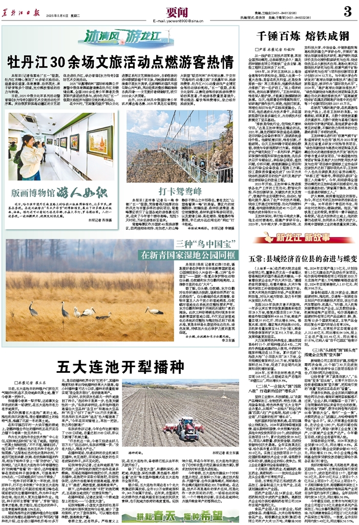 本报讯(陈辰 记者贾红路)日前,摄影爱好者在伊春市丰林县新青国家湿地公园捕捉到令人兴奋的一幕:三种“鸟中国宝”——国家一级重点保护野生动物白头鹤、白枕鹤和东方白鹳同框亮相,上演春日里的生态“大片”。