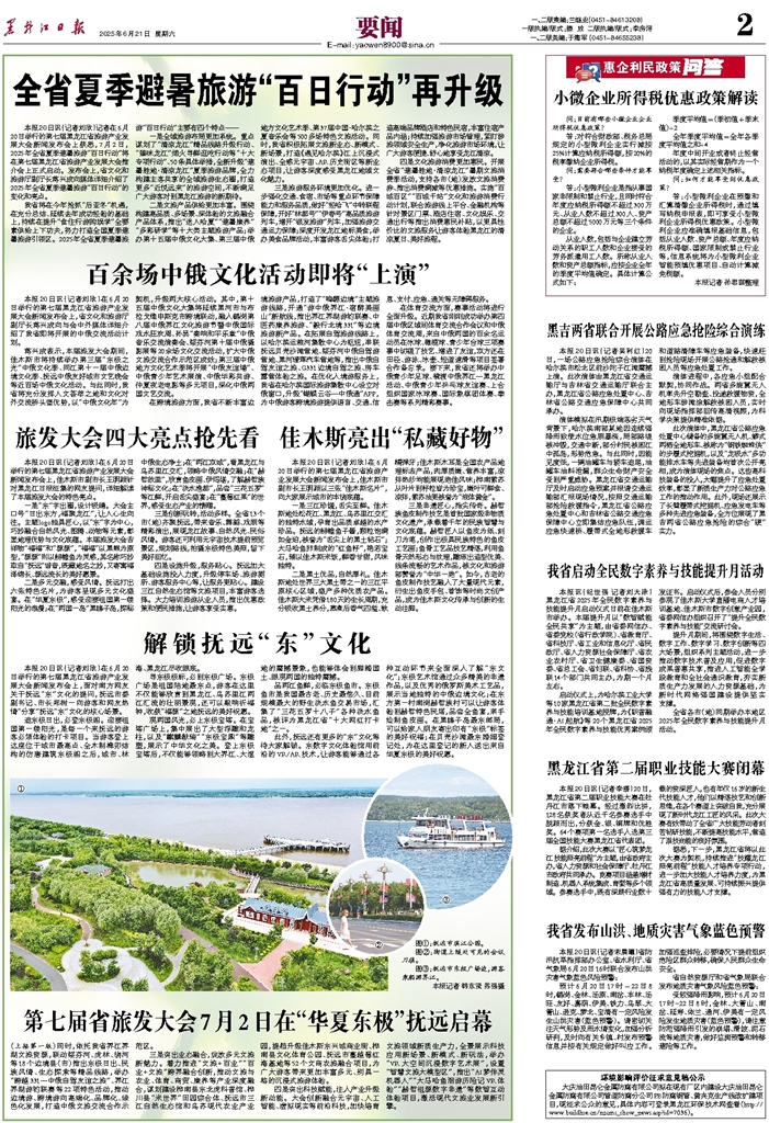 本报20日讯(记者刘欣)记者在6月20日举行的第七届黑龙江省旅游产业发展大会新闻发布会上获悉,7月2日,2025年全省夏季避暑旅游“百日行动”将在第七届黑龙江省旅游产业发展大会推介会上正式启动。发布会上,省文化和旅游厅副厅