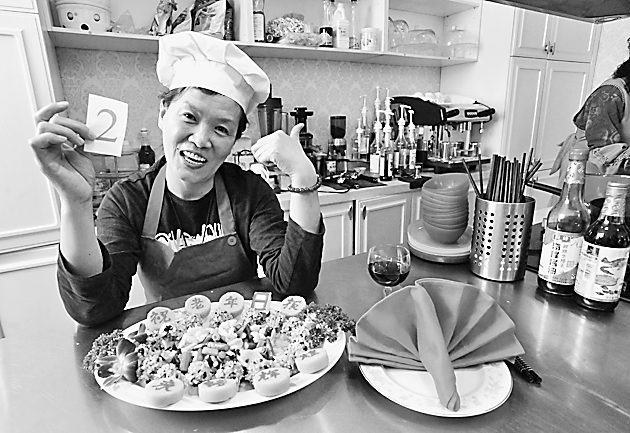 訛中餐类特等奖获得者蒋炳爱在展示她的“什锦荟萃”。