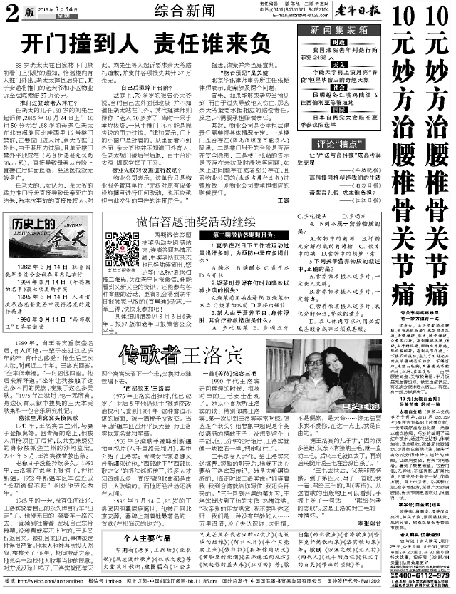 1989年,当王洛宾重获盛名后,有人问他:一辈子坐过这么多年的牢,有什么感受?他先后三次入狱,时间近二十年。王洛宾回答:“坐牢很幸福。”一时语惊四座。他后来解释道:“坐牢让我接触了这么多不同的民族,搜集了这么多民歌。”1975年出狱时,他一无所有,身边仅有从狱中搜集的三大本民歌集和一包音乐研究札记。 监狱里用窝窝头换民歌 1941年,王洛宾去兰州,与妻子登报离婚。回青海的路上,他被人用枪顶住了后背,以共党嫌疑犯的身份被抓进兰州的沙沟监狱。1944年5月,王洛宾被营救出狱。 安稳日子没能持续多久。1951年,王洛宾在课堂上被捕了,押往新疆。1952年新疆军区军法处以“长期逾假不归”判处他劳役两年。” 1965年的一天,没有任何征兆,王洛宾骑着自己的永久牌自行车“出走”了。他漫无目的,骑着车一路东去,一直骑到吐鲁番,发现自己忘带粮票,没粮票就买不上吃的,于是又折返回来。被抓回来以后,事情被定性得很严重。他本人也被再次投入监狱,整整关了10年。期间劳动之余,他总会主动找他人收集当地的民歌。对方说没劲儿唱了,王洛宾就把每天两个窝窝头省下一个来,交换对方继续唱下去。 “西部歌王”王洛宾 1975年王洛宾出狱时,他已62岁了,此后5年他仍处于“被剥夺政治权利”。直到1981年,这种窘迫不堪的局面,被一篇稿子所改变。当年,新疆军区召开平反大会,为王洛宾恢复名誉和军籍。 1988年台湾歌手凌峰到新疆拍电视片《八千里路云和月》,其中介绍了王洛宾;香港女作家夏婕又赴新疆采访他,“西部歌王”“西部民歌之父”的提法渐渐传开,很多人才知道那么多一直传唱的歌曲都是由同一人改编的,而他历经浩劫还活在人间。 1996年3月14日,83岁的王洛宾因胆囊腺癌离世。他被迁回北京安葬,墓碑上刻着他最著名的一首歌《在那遥远的地方》。 一首《等待》纪念三毛 1990年代王洛宾走向辉煌的时候,海峡对岸的三毛女士出现了。她从小喜欢听王洛宾的歌,特别仰慕王洛宾。第一次见到王洛宾非常吃惊:怎么是个老头?她想象中起码是个英俊潇洒的情歌王子,没想到留个山羊胡。但几分钟的对话后,王洛宾就像一块磁石一样,把她吸住了。 三毛是受人之托,给王洛宾来送稿费。短暂的聊天后,她就下决心要给王洛宾写传记。她是去新疆旅游的,临走时跟王洛宾说:“你等着我,我到台湾就给你写信,我还会再来的。”三毛回到台湾的第九天,王洛宾就收到了她的来信,热情洋溢,“我亲爱的朋友洛宾,我不要叫你老师,我们是一种没有年龄的人……万里迢迢,为了去认识你,这份情,不是偶然,是天命……你无法要求我不爱你,在这一点上,我是自由的。” 据王洛宾的儿子讲,“因为很多差距,父亲不肯接纳三毛,就一直劝三毛。后来三毛就回去了。再到后来就听说三毛在台湾自杀了。” “三毛去世后,父亲非常伤感。到了第四天,写了一首歌,我一看,写给三毛的,叫《等待》。从这首歌的出版物上可以看到,手稿上多了一句话———‘献给死者的恋歌’。这是王洛宾对三毛的一种情怀。” 本报综合 个人主要作品 早期有《老乡,上战场》《洗衣歌》《风凌渡的歌声》《奴隶之爱》等大量抗日歌曲;建国后有《社会主义光芒照在我老汉的心坎上》《达坂城的姑娘》)《阿拉木汗》《半个月亮爬上来》《依拉拉》《我等你到明天》《黄昏里的炊烟》《在那遥远的地方》《掀起你的盖头来》《亚可西》等;歌曲集《西北歌声》《青海歌声》《哈萨克抒情歌曲集》《洛宾歌曲集》等;歌剧《沙漠之歌》《无人村》《两代人》《战斗的历程》《托太尔的百灵》《带血的项链》等。