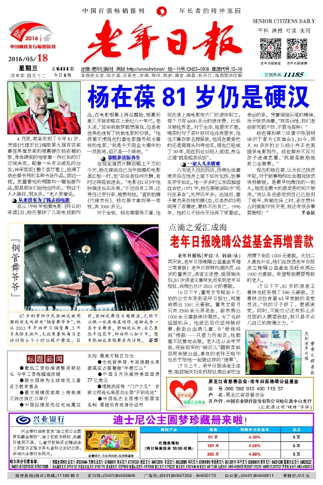 老年日报讯(亓红/文韩璐/摄) 两天来,老年日报晚晴公益基金再增三笔善款!老年日报特约通讯员、65岁的董秀文,读者王连贵、姚丽娴夫妇,83岁读者王喜林先后来到老年日报社,共捐出总计2501元的善款。 16日下午,董秀文专程坐十几站的公交车来到老年日报社,郑重地捐出1001元善款。董秀文每月只有2200余元养老金,毅然捐出1000余元善款绝非偶然。为了当好祖国的兵,他退伍后仍坚持做好事,救助白血病儿童、为“拇指妈妈”捐款……只要力所能及,他都毫不犹豫地去做。老人还从去年开始,将拾回来的“破烂儿”翻新卖钱后用来做公益,善良的老伴王晓华也乐于陪他一起做这样的“傻事”。 17日上午,老年日报读者王连贵、姚丽娴夫妇来到报社捐出省吃俭用攒下来的1000元善款。夫妇二人善良朴实,他们在获悉老年日报成立晚晴公益基金后赶来捐出1000元善款,希望帮助需要帮助的老人。 17日下午,83岁的读者王喜林也赶来捐了500元善款。王喜林这位有着62年党龄的老党员说,“我的日子好了,要感谢党。同时,不能忘记还有那么多贫困的人需要救助,我只是尽点儿自己的微薄之力。” 黑龙江省慈善总会·老年日报晚晴公益基金 账号:08059201040011557 户 名:黑龙江省慈善总会 开户行:中国农业银行股份有限公司哈尔滨中山支行 (汇款请注明“晚晴”字样)