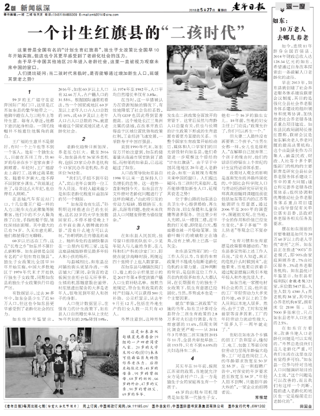 这里曾是全国有名的“计划生育红旗县”,独生子女政策比全国早10年开始实施,但这也令其更早感受到了老龄化社会的压力。 由于早于中国其他地区20年进入老龄社会,这里一直被视为观察未来中国的窗口。 人们提出疑问:当二孩时代来临时,是否能够通过增加新生人口,延缓其衰老之势? 1 59岁的王广福守在亚萍国际广场门口,这里是江苏如东县的繁华地带之一。他脚半蹬在人力三轮车上等待生意。每有人靠近,他都下意识起身相迎。一顶毛线帽并不能遮住他鬓角的斑白。 王广福的生意并不是很好,有时一个上午也等不到一个客人。他有一个独生女儿,目前在苏州工作,快80岁的母亲在乡下老家由妻子照顾着。年轻时,王广福曾去上海打工,还做过蔬菜批发。随着年岁渐大,他不得不回到家乡谋生,“我姐姐过世了,母亲这么大年纪,也总得有人照顾。” 在县城汽车客运站门口,十几位像王广福一样的人力三轮车夫在此聚集等候乘客,他们中的不少人鬓角掺了白发,手指粗糙干裂,皱纹深刻在面颊。其中最大的已有74岁。久无生意光顾,他们都显得百无聊赖。 60岁以后还在工作,这在“长寿之乡”如东并不算什么新鲜事。如东县曾是全国有名的“计划生育红旗县”,独生子女政策比全国早10年开始实施,中国大多数地区于1970年代末才开始执行独生子女政策,同期如东县的独生子女政策执行日趋严厉。 有数据显示,过去30多年中,如东全县少生了近50万人口,但这也令如东县更早感受到了老龄化社会的压力。 如东统计年鉴显示,2016年,如东60岁以上人口有32.66万人,占户籍人口的31.55%。根据国际通常的看法,当一个国家或地区60岁及以上老年人口占人口总数的10%,或65岁及以上老年人口占人口总数的7%,就意味着这个国家或地区进入老龄化社会。 2 老龄化趋势日渐加深,养老压力巨大。截至2016年,如东县共有36家养老机构,包括23家公办养老机构个13家民办养老机构,养老床位7652张。 “我们几乎招不到年轻人”,宾山老年公寓的一位工作人员说。年轻人越来越少是如东老龄化程度日益加深的另一个侧面。 “如东没有夜生活,”孙明明这样描述自己的生长地,这名22岁的大学生放假回家后,不得不接受晚上7点半商业街人烟稀疏的场景。“没有什么地方可以去玩,”孙明明趴在肯德基的桌上。她所身处的连锁快餐店在一公里内有两三家,这是这座县城能够看见最多年轻人和小孩的场所。 与县城相比,如东县岔河镇的街头更显冷清,一些店铺大门紧闭,杂货店的老板闲坐在柜台后无所事事,生锈的机器随意散在道旁。村庄里进出屋舍的大多是老年人,很难见到年轻人和孩子的身影。 人口统计数据显示,在强有力的计生政策下,如东县人口自然增长率从上世纪70年代初的20‰降到10‰,从1974年至1982年,人口平均自然增长率仅有3.8‰。 在当时,这一举措被认为在资源短缺的情况下,有效地降低了社会负担系数,人均GDP也因此得到显著提高。这个地处长江三角洲北翼的县城,在改革开放后得益于区域位置优势和政策红利,工业经济飞速发展,一举跻身于中国百强县。 直到1990年代末,如东官方开始注意到,如东的储蓄量从南通市居首跌到了最低,而相邻的如皋县,已远远超过了如东。 人口政策导致如东县自1998年以来一直保持人口负增长的态势。这一趋势一直影响到今天。如东县官方文件曾对老龄化问题进行了这样的阐述:“由此将引发的劳动力短缺、婚姻挤压、生源、兵源等问题,也使未来我县人口问题变得更为错综复杂。” 3 在如东县人民医院,挂号窗口前排的队伍中,少见年轻人与儿童的身影,在儿科和妇产科的诊室门口,即使在就诊高峰时段,两侧近四十张椅子上也人数寥寥。 在如东县马塘镇医院门口,墙上的公示栏里显示的是2017年第4季度该镇户籍人口生育补贴名单。按照当地规定,符合生育政策的农村产妇每人可以获得500元补助。公示栏显示,从去年9月至12月,包括在外地生产的妇女人数一共只有43人。 外界注意到,这种形势发生在二孩政策全面放开的背景下。这背后虽然与育龄人口总量有关,但也与长期的计生政策下形成的生育意愿有着更为直接的关系。当整个国家生育政策开始松动后,媒体和人口学家们的目光曾投射向如东县,他们希望进一步观察这个曾经的“计生红旗县”。由于早于中国其他地区20年进入老龄社会,如东一直被视为观察未来中国的窗口。人们提出疑问:当二孩时代来临时,是否能够增加新生人口,延缓其衰老之势? 位于泰山路的如东县公共卫生中心提供婚检、再生育咨询、妇女保健和儿童保健等诸多服务。但这里少有人光顾,从一楼到二楼,近半数的灯关着,即使是白天,整座楼也被一片昏暗笼罩。放着叶酸片的玻璃柜立在墙角,没有上锁,柜上已落一层灰尘。 如东县宣传部门的一位工作人员认为,当前的生育政策并不能成为阻断老龄化危机的主要力量。这种判断的背后,是包括这位工作人员在内的很多如东人大都认同,在长期强有力的独生子女政策下,低生育意愿已经固化,当然,养育成本也是一个主要因素。 就在“单独二孩政策”实施的当年,如东卫计委对全县符合二孩生育政策的2.8万多对夫妇进行调查,有生育意愿的11.6%,但现实则比调查更严峻——从2014年3月单独二孩实施到2015年10月,全县共审批单独二孩193件,只有不到0.69%的夫妇选择生二孩。 4 其实早在10年前,按照