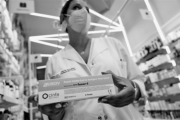 西班牙政府从7月20日起允许药店出售新冠病毒快速自测产品,人们无需处方即可购买。 图为21日,西班牙马德里一家药店的药剂师展示一盒新冠抗原检测试剂。新华社