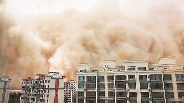 25日中午,敦煌地区出现罕见沙尘暴天气,巨大的沙墙自西向东滚滚而来,所到之处,黄沙遮天蔽日。新端