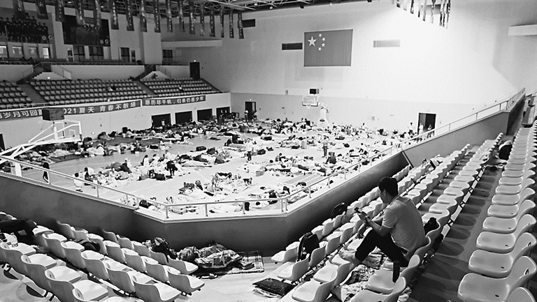 25日晚,在上海建桥学院的体育馆内,临港新片区工作的务工人员在此休息。上海市防汛指挥部办公室称,受台风“烟花”影响,截至25日22时,上海市共转移撤离36.1万人,其中浦东新区因靠海的原因转移人口最多。殷立勤