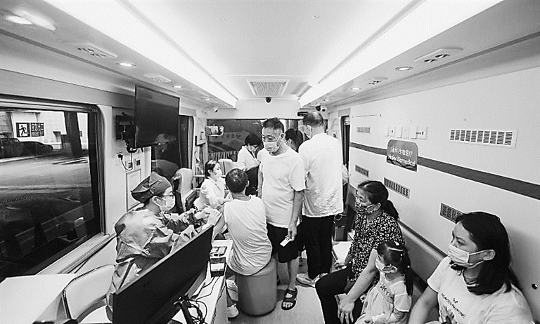 28日,浙江杭州,多名旅客在移动疫苗接种车内接种新冠疫苗。27日,杭州首辆新冠疫苗移动接种车开进杭州火车东站,为旅客提供为期一周的免费新冠疫苗接种。未接种或仅接种过一剂灭活疫苗的旅客,凭车票都可以前来接种。王刚