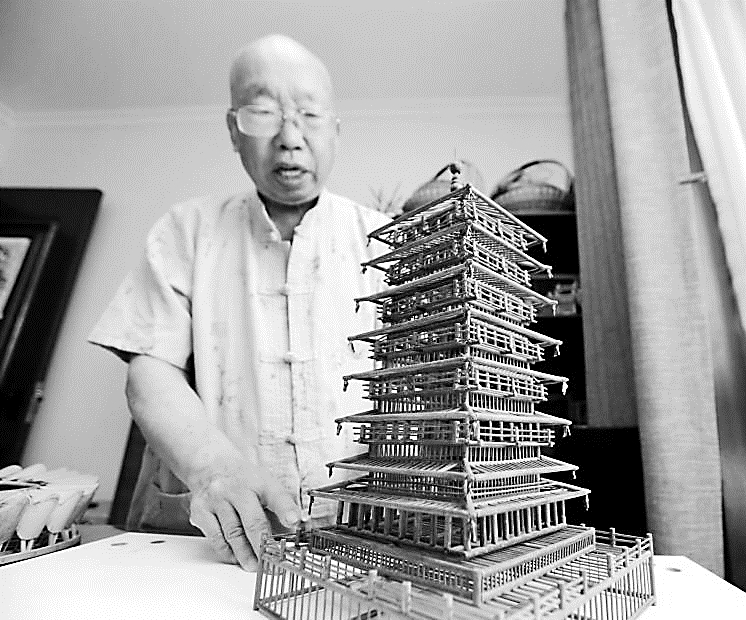 78岁的经金山是陕西省非物质文化遗产民间竹扎技艺第三代传承人,自幼师从父亲学习竹扎、木工技艺。经金山希望用自己的方式,将历史用竹扎记录下来。图为经金山展示长安塔竹扎模型。 张远