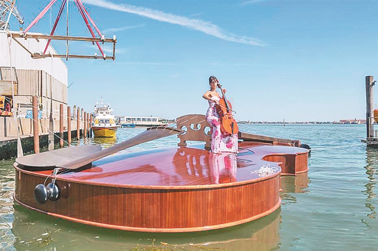 近日,为向新冠肺炎逝者致哀,意大利艺术家特地打造了一艘巨大的“小提琴”浮船。图为身穿晚礼服的大提琴演奏家坐在“小提琴”浮船的“琴架”上拉响乐曲。中新