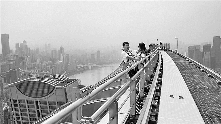 近日,重庆来福士推出高空露天体验项目“Skywalk云中漫步”。该项目位于250米高空,由120米内侧步道与120米悬空步道组成。项目全程系安全绳索,并由安全员引导和带领,独具挑战与刺激。何蓬磊