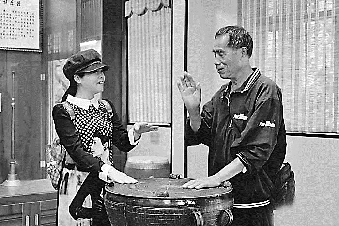 韦显成(右)向游客介绍民族乐器馆内的乐器。