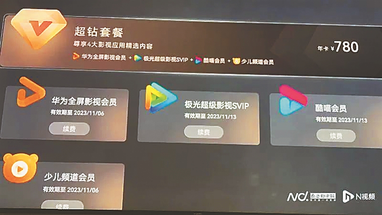 8月22日,某调查机构实测发现,以一台华为智慧屏电视自带的会员体系为例,如果根据页面上显示的会员价格购买完各家会员,数目相当惊人——其中,单会员就包括华为全屏影视会员(包含芒果全屏影视会员+TVB经典港剧)、华为视频少儿会员、极光超级影视VIP、酷喵会员。另外,在优选视频应用板块中还有奇异果、华数TV、埋堆堆、4K花园、云视听小电视等十余家视频平台会员。
