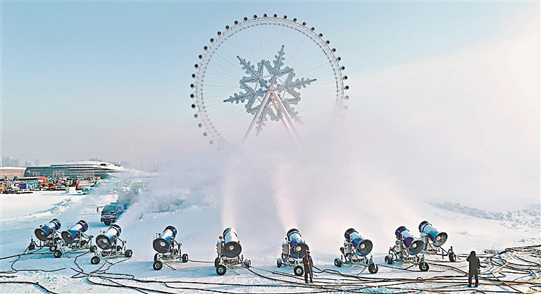 26日,第二十五届哈尔滨冰雪大世界园区内,多台造雪机喷射出洁白的人造雪花在园区内飘洒,这标志冰雪大世界造雪工程全面启动。据悉,本届冰雪大世界将使用25万立方米的雪和冰。