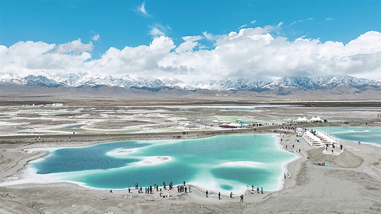 近日,位于青海省海西州的大柴旦翡翠湖,形态迥异、深浅不一的盐池湖水在阳光下清澈湛蓝,宛如一块块晶莹剔透的“翡翠”,吸引各地游客观光游览。