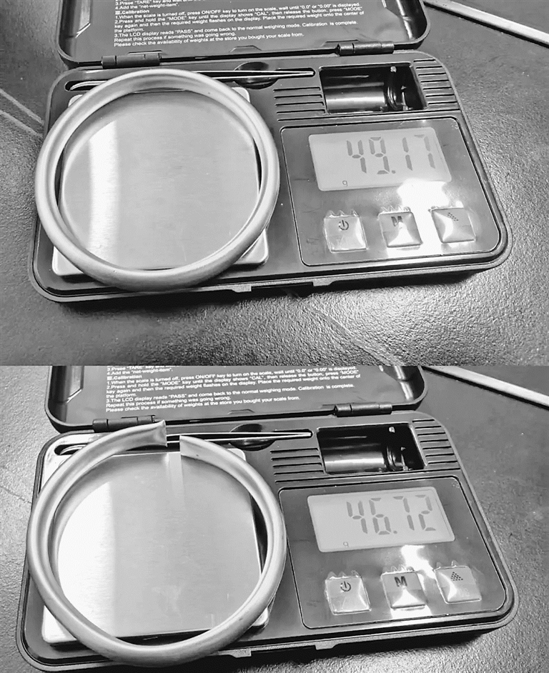 彭佳的手镯剪开后流出液体,液体排空后,手镯重量缩水。