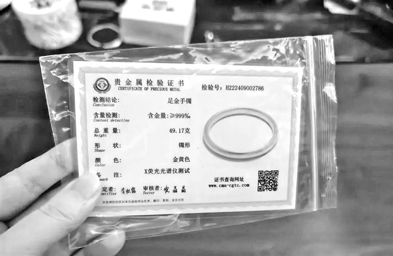 省下一大笔钱的彭佳并不放心。深圳水贝有大大小小上百家检测机构,她交了25元检测费,将手镯送检,大约1小时后,她拿到了检测结果:手镯含金量大于或等于999‰,克重为49.17克,误差在0.01克以内。彭佳这才放心,相信自己真的“薅到了羊毛”。