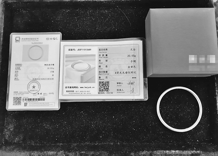 彭佳购买手镯后的鉴定证书显示手镯材质为足金,事后她得知检测结果仅为手镯表面含金量。