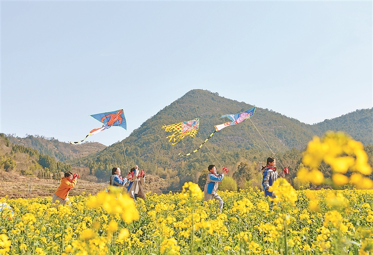 各地春花陆续绽放,神州大地处处都是烂漫春景。图为浙江省台州市仙居县双庙乡中心小学学生在油菜花丛中放风筝。新华社