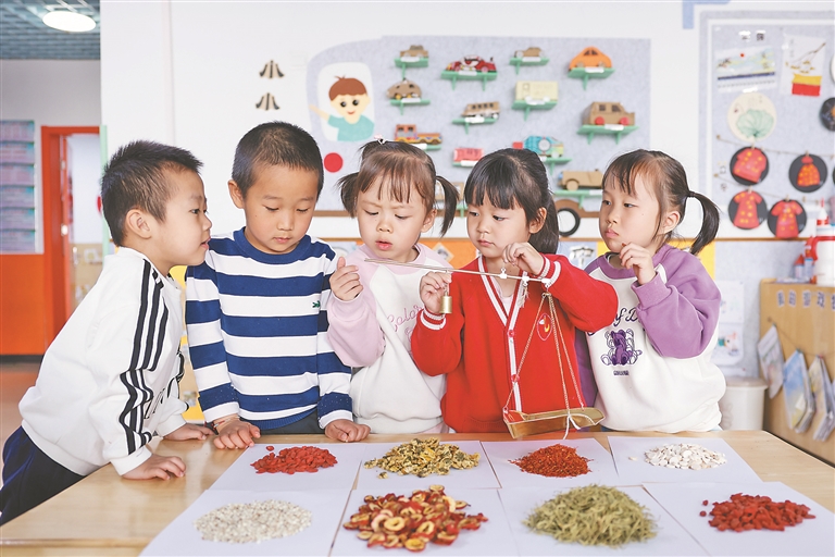 7日是世界卫生日,国家卫生健康委将今年中国宣传主题定为“保障母婴健康 呵护祖国未来”。图为河北省唐山市丰南区岔河镇中心幼儿园小朋友学习辨识中药材。