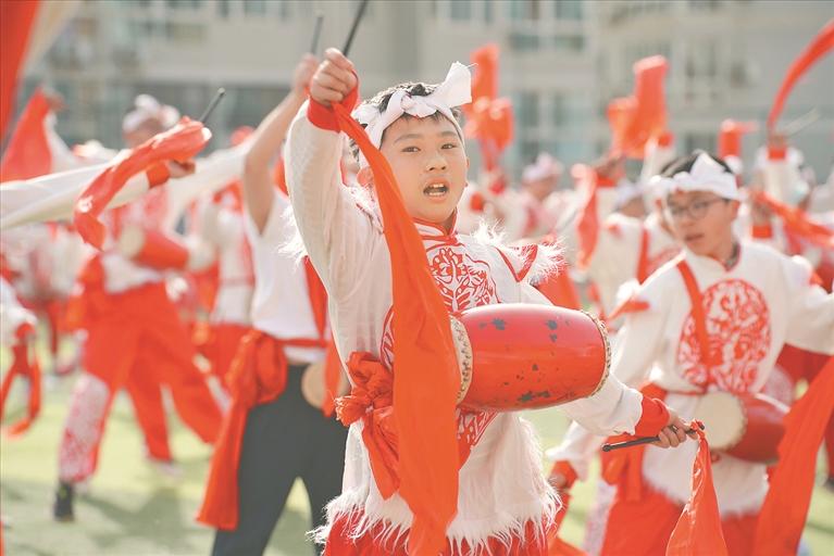 西安市义务教育阶段学校通过课间15分钟、阳光体育大课间30分钟等形式,鼓励学生走出教室、运动起来。图为西安辅轮中学学生在阳光体育大课间30分钟练习腰鼓。新华社