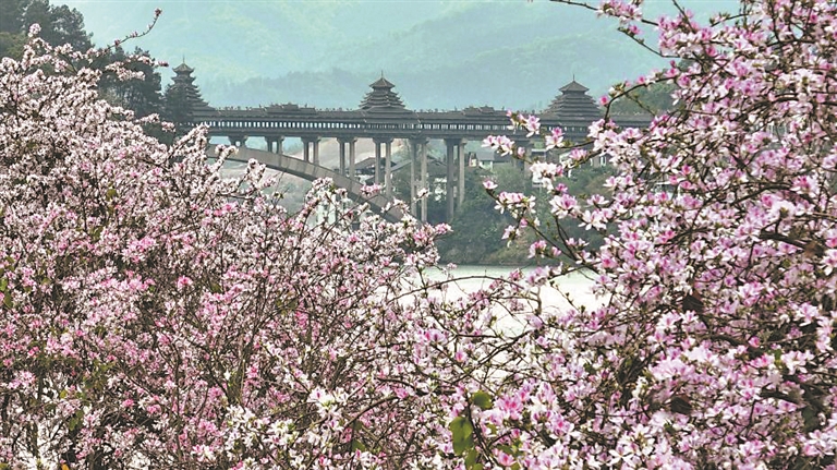 近日,广西三江侗族自治县县城主干道两旁、河堤沿岸等地种植的洋紫荆花竞相绽放,烂漫花海与侗乡特色楼桥相映成趣,勾勒出一幅传统与自然交融的画卷。图为三江侗族自治县洋紫荆花美景。龚普康