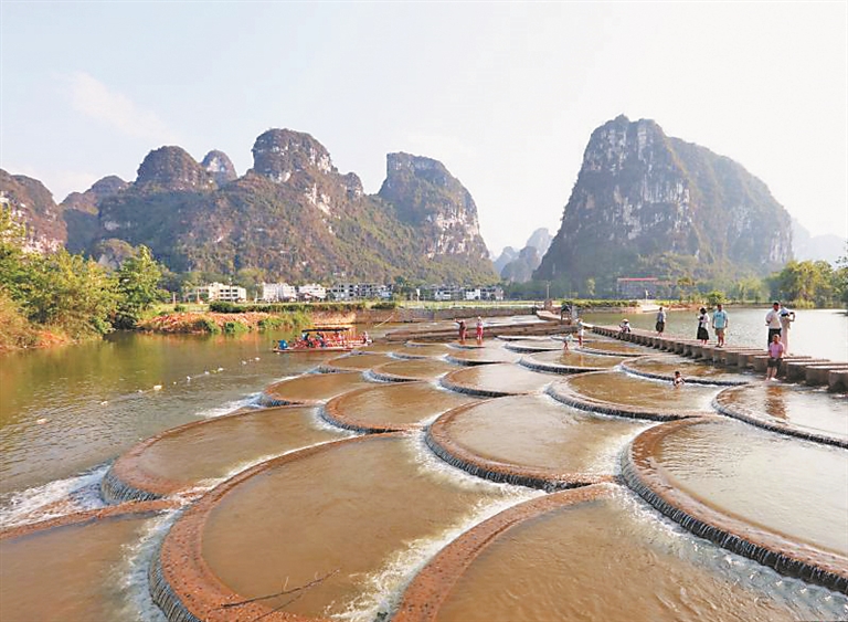 近日,镜头下的中越边境广西崇左市大新县明仕田园,峰林错落,碧水蜿蜒,宛若仙境。明仕田园地处桂南典型的喀斯特地貌地区,素有“山水画廊”美称。图为游客在明仕田园游玩。