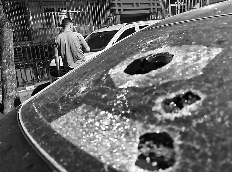 5月14日,北京石景山区杨庄地区,多辆轿车玻璃被大冰雹损坏。