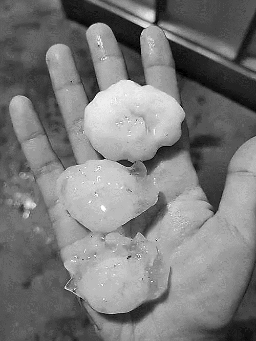城里的冰雹个头不大,也就玉米粒到分币大小。后来从四面八方传来的视频显示,原来很多地方落下的是更大个的冰雹。北京这场冰雹范围广,个头大,已经构成了雹灾——我看到有人手中托着比鸡蛋还大的冰疙瘩,白亮亮的;有人展示的冰雹竟然比鸡蛋大了好几圈,如小拳头那么大。冰雹从天而降,不均匀地砸向全城,并且还是间歇性地发作。