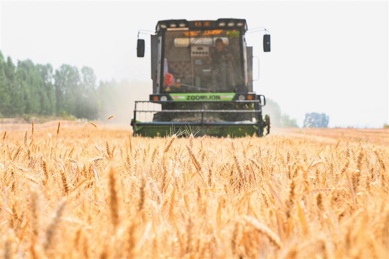 初夏,乡村振兴新动能蓬勃释放。麦浪在田野间翻涌,一曲悦耳动听的田园乐章欢快奏响。图为26日,农机手驾驶收割机在河南省济源市克井镇田间收割小麦。