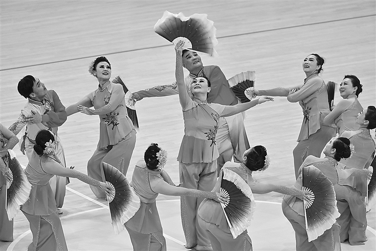 日前,2025年全国老年人健身秧歌交流活动规定项目比赛在新疆维吾尔自治区奎屯市体育馆完赛。 图为山东省老年人体育协会代表队在比赛中。 徐宏岩