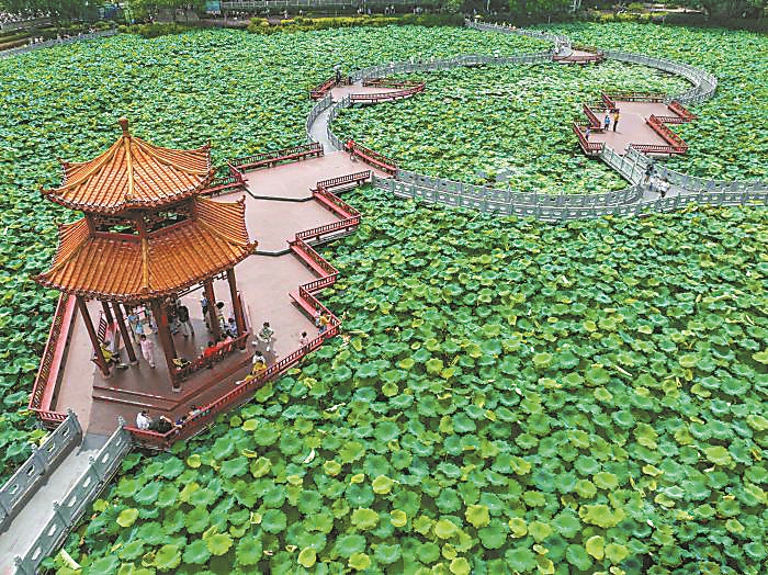 近日,在广西梧州市万秀区潘塘公园,游人赏荷游玩,乐享美景。