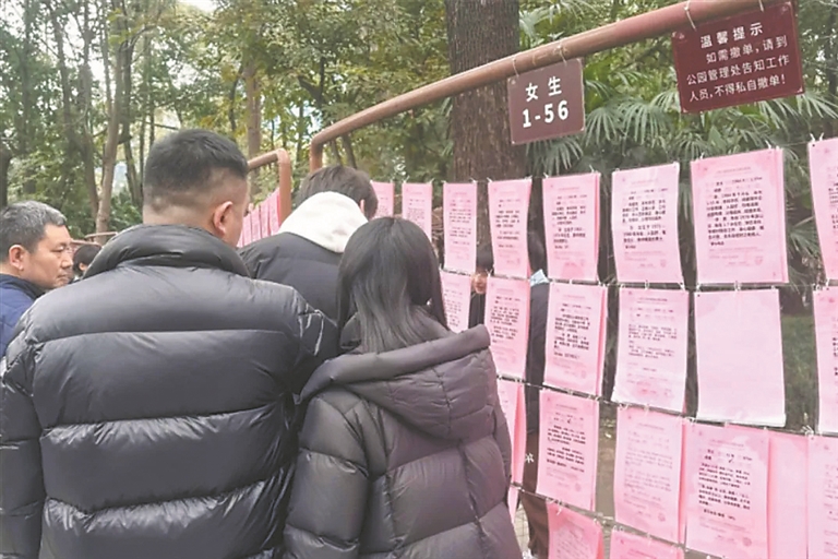 不久前,一个周二的下午,天气并不算晴好,但成都人民公园的相亲角一如既往的热闹。数块面板在道路两侧整齐地挂着,按性别分成两片区域,男性与女性的信息表分别用蓝色与粉色纸,每块面板正反面都被贴得满满当当,两侧几乎都站满了驻足细看的人。