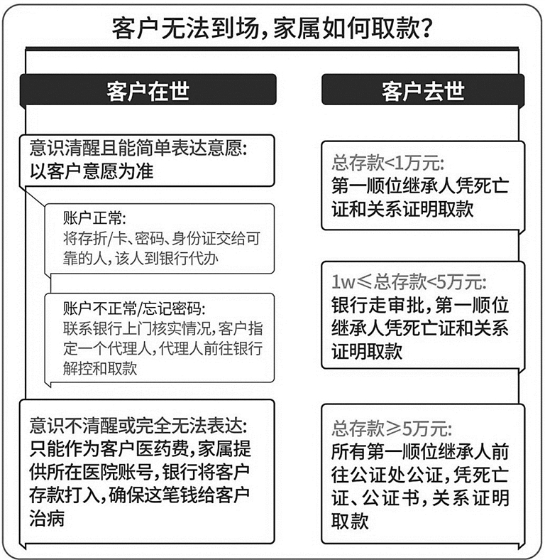 银行从业者刘娜(化名)常会面对这类特殊情况。有时客户无法到场,家属前来咨询取款问题,她会综合具体因素,给出相应答复。