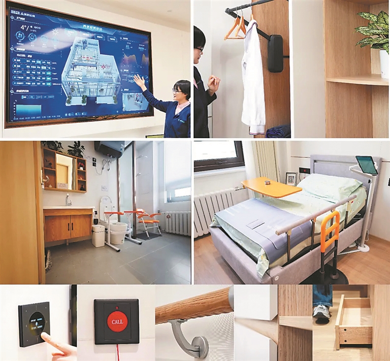 在北京海淀区三里河社区养老服务驿站,适老化改造样板间展示了从全屋智慧运维系统、起夜水吧、高隔声墙,到衣柜、卫生间、防水拉绳紧急呼救器、防滑扶手、隐藏拉手、踢脚抽等多项方便老年人使用的项目及细节。