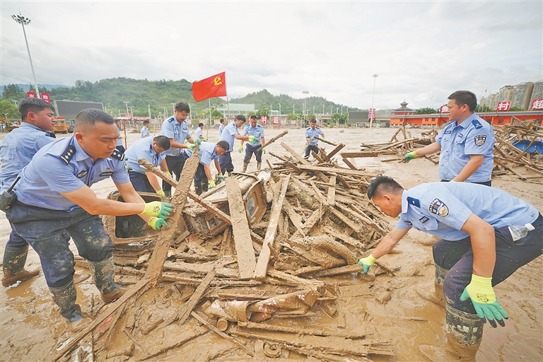 贵州省榕江县发生特大洪涝灾害以来,共产党员们冲锋在前,在急难险重任务面前勇挑重担,党旗在榕江抗洪一线高高飘扬。图为丹寨县公安局的党员民警潘建航(左二)和同事一起清理因洪灾受损的球场设施。