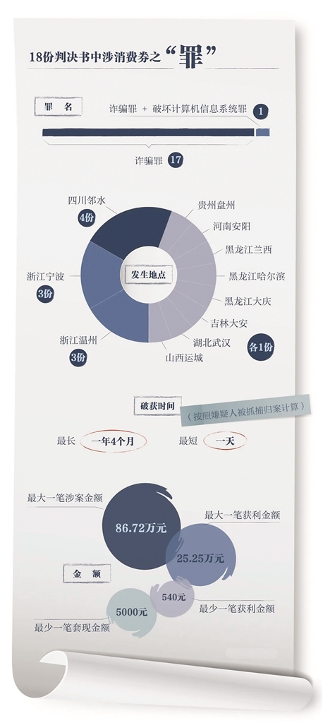 在裁判文书网上,以“消费券、刑事案由”为关键词,从2024年1月开始,截至今年6月,共有18份相关法律文书,当事人皆因诈骗罪获刑。
