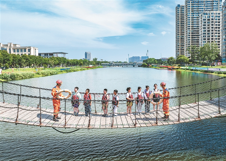 暑假来临,各地开展暑期安全教育主题活动,提高学生们的安全意识和自救自护能力。图为在江苏省兴化市昭阳湖公园,兴化市消防救援大队消防员指导学生学习防溺水自救互救的基本知识与技能。