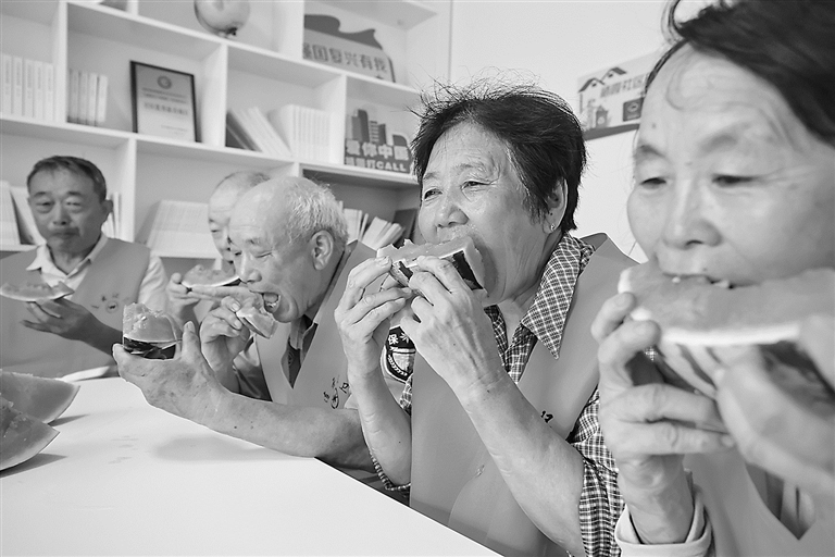 高温持续,各地开展形式多样的关爱活动,为户外劳动者送上清凉。 图为在江苏连云港市墟沟街道栖霞社区爱心驿站,环卫工人吃西瓜消暑。