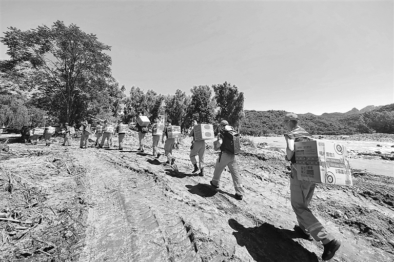 近日,北京密云等区遭遇特大暴雨,多个乡镇受灾。有关部门组织消防、民兵等多支救援力量,将救灾物资徒步运送到村,保障受灾村民的生活需求。图为密云区消防救援支队的救援人员为道路被阻断的村庄运送物资。