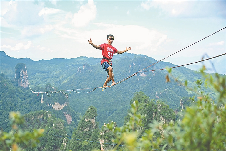 18日,2025张家界国家森林公园黄石寨景区“亚洲之王”千米高空扁带争霸赛开赛。10个国家的顶尖选手,在海拔1092米高的黄石寨峰巅惊险挑战千米之长的高空扁带争霸“亚洲之王”。