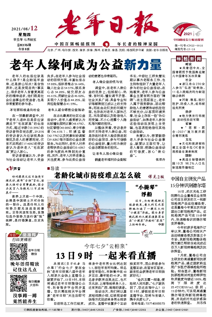 老年人的生活应该是什么样子?是企盼延年益寿,还是游山玩水?是含饴弄孙,还是发现自我?事实上,很多老年人有着更高层次的精神追求,他们既是社会公益事业的受益者,也是非常重要的参与者。不宅家积极走向社会