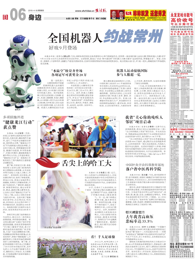 本报29日讯(首席记者崔立东)今天,国家体育总局社会体育指导中心举行新闻发布会,宣布第一届全国机器人运动大赛(简称机器人大赛)将于9月15日至18日在江苏省常州市武进区举办。记者获悉,被冠以“武进·神州通信杯”的机器人大赛主题为“运动炫科技,智慧赢未来”。各省、自治区、直辖市、计划单列市、新疆生产建设兵团体育局、总参军训部军事体育训练局将组队参加。地方院校由省(区、市)统一组队,部属院校可单独组队报名参赛。 “水陆空”较量齐登场各项冠军可获奖金20万第一届机器人大赛将按照《中国素质体育机器人运动通用竞赛规则》的有关规定,设陆地机器人项目、水中机器人项目和空中机器人项目。其中陆地机器人项目包括机器人马球赛(室内)、机器人障碍赛、机器人舞蹈赛;水中机器人项目为水中机器人对抗赛;空中机器人项目包括无人机花样队列赛、无人机任务赛。机器人大赛的组别分为青年组(14岁至17周岁)和成人组(18周岁以上,含18周岁)。 本届机器人大赛各项目各组别前三名的奖金分别为第一名20万元、第二名10万元、第三名3万元。此外,机器人大赛组委会将向所有参赛队颁发荣誉证书,并设立“体育道德风尚奖”、“最佳组织奖”,评选范围包括记分员、裁判员、仲裁员、教练员、运动员、运动队、支持单位、主办单位等。 机器人运动接轨国际参与人数超一亿 据大赛组委会新闻发言人介绍,中国机器人运动自2011年被国家体育总局纳入社会体育运动项目以来,在全国各地迅速掀起了机器人教育培训、专业资格认证和机器人体育竞赛的热潮。按照有关规定,已在全国范围内开展了机器人体育、赛事、培训、专业资格认证等工作。机器人竞赛器材的标准化生产,各类教材在全国范围的出版发行,教学标准、培训标准、认证标准的制定,为素质体育人才培养、教育培养、专业培训提供了强有力的保障。 三年来,在全国范围内举办了万场以上各级各类机器人积分联赛、锦标赛、公开赛,参加人数超过1亿人次,获得专业资格认证的专业人才已超过千万人。该新闻发言人说,第一届全国机器人运动大赛的举办标志着我国机器人运动已与国际接轨,该大赛在中国机器人运动发展史上具有里程碑意义。